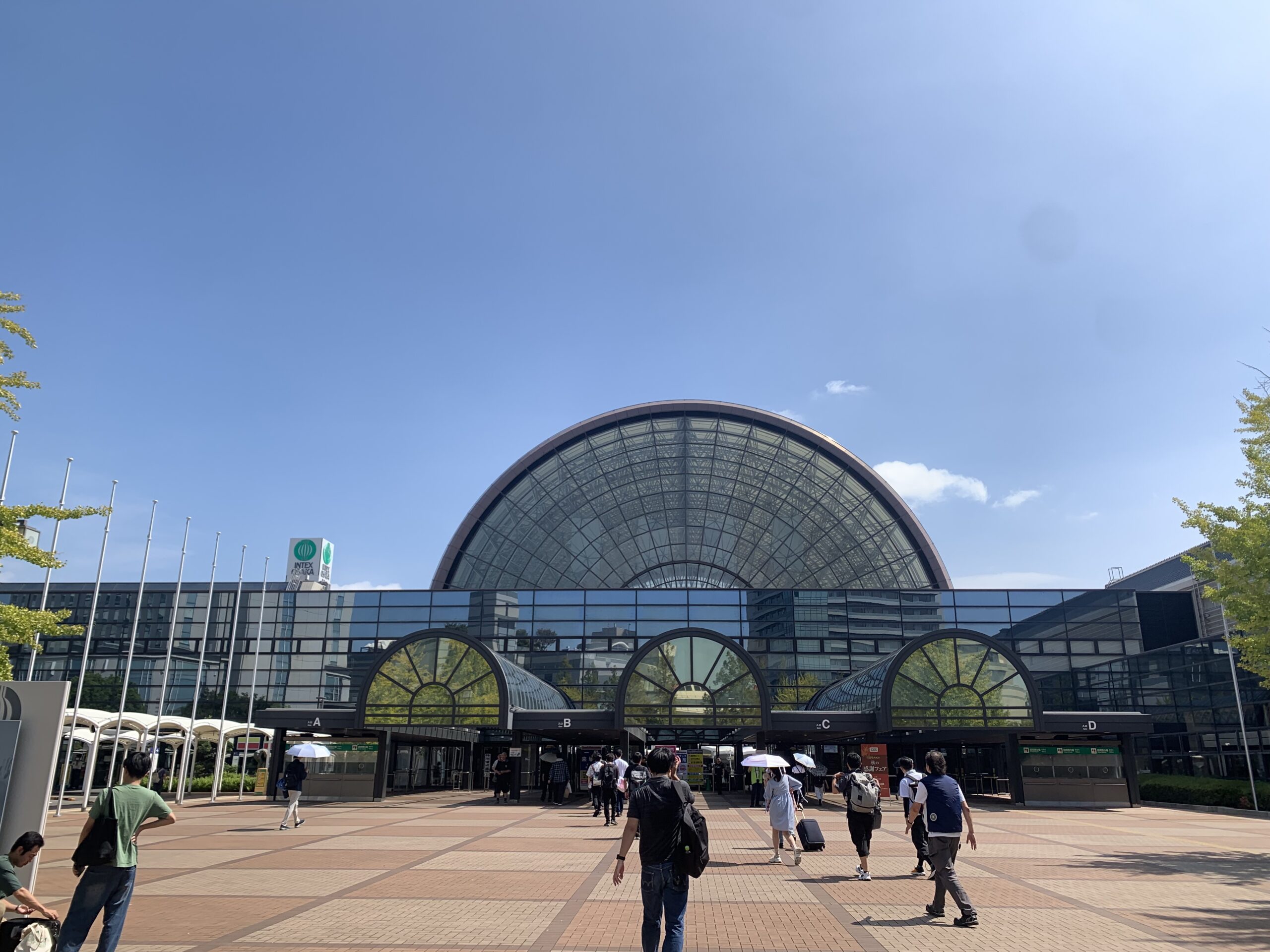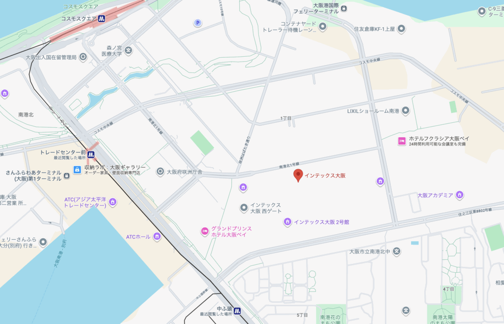 インテックスの最寄駅は大阪メトロ南港ポートタウン線(ニュートラム)の「トレードセンター前」と「中ふ島」のどちらかですが、中ふ頭から向かうと連絡通路を渡って直結なので最短経路だと思います。