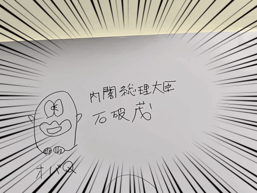なんだかこの落書きが総理大臣という肩書きを捨てたくない石破さんの気持ちを代弁しているように感じられて哀惜の念を抱かずにはいられません。