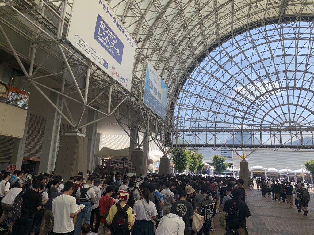 最終的に待機列は4列+半で収まり、コミケと比べると「えっこれだけ!?」と思いましたが、後ろの二人組が「去年は3列だったのに今年は多いな」と言っていたので、これでも多い方なのでしょう。