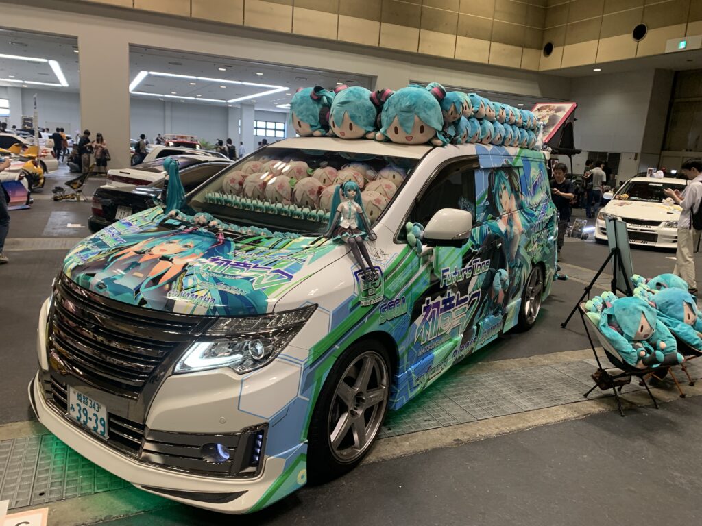 すげぇ…ちなみに後ろのリアガラスにフルスクリーンのディスプレイがついており、mmd動画が流れていました。ところでこれ運転する時って、フロントガラスの桜ミクは取るとして屋根のミクは乗せたまま運転するんですかね…?