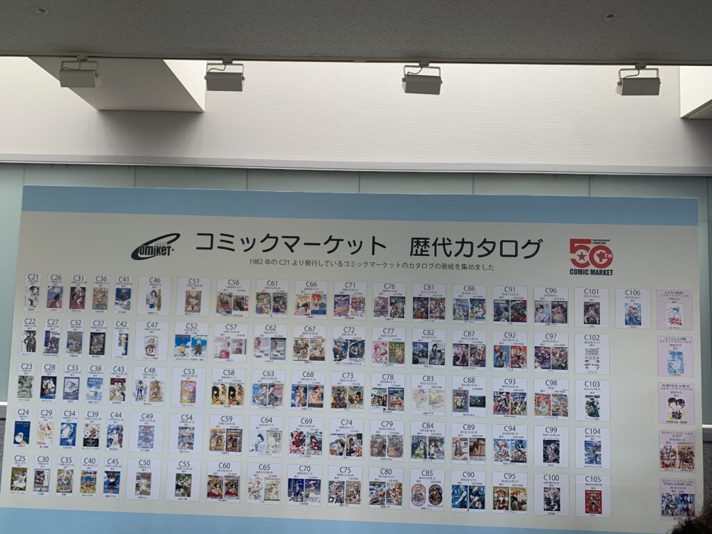 今年はコミケ開催50周年ということで、歴代カタログ表紙パネルが設置してありました。見切れていますがこの隣に初参加の回にシールを貼るエリアがあり、「C1〜C13」に何枚かシールがあって驚きました。歴戦のおじい(おばあ)だ…
